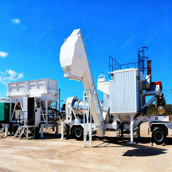 主要结构组成 一台典型的移动滚筒式沥青搅拌设备通常包含以下几个关键系统: 冷料供给系统: 组成部分: 冷料仓、给料机、集料皮带机。 功能: 储存不同规格的砂、石等骨料,并按预设比例将骨料输送至干燥滚筒。 干燥搅拌滚筒(核心部件): 结构: 一个倾斜安装、可正反转的长形滚筒,内部装有不同形式的叶片。 功能: 这是它与间歇式设备最根本的区别。骨料在这里完成以下所有工序: 烘干与加热: 滚筒前端通入高温烟气,骨料在滚筒内被翻滚、提升,与热气流充分接触,去除水分并加热到设定温度(通常160-180°C)。 拌和: 在滚筒的中后部,加热后的骨料与按比例计量的沥青、矿物粉(填料)一同被投入,在滚筒的继续旋转和叶片的作用下,被充分、均匀地搅拌成合格的沥青混合料。 燃烧系统: 组成部分: 燃烧器、燃油(或燃气)供应系统、鼓风机。 功能: 产生高温、稳定的火焰和热烟气,为干燥滚筒提供热源。 沥青供给系统: 组成部分: 沥青保温罐、沥青泵、计量装置。 功能: 将液态沥青加热并保温,然后精确地泵送到干燥搅拌滚筒中。 粉料供给系统: 组成部分: 粉料仓、螺旋输送机、计量装置。 功能: 储存和精确添加矿物粉(填料),以改善沥青混合料的性能。 除尘系统: 组成部分: 重力除尘器、布袋除尘器(主流)、引风机。 功能: 收集干燥和搅拌过程中产生的粉尘,确保排放达标,保护环境。 控制系统: 功能: 通常采用PLC(可编程逻辑控制器)和工控机,实现对整个生产过程的自动化控制、配方管理、数据记录和故障诊断。操作员在控制室内即可完成全部操作。 移动底盘: 功能: 将上述所有系统模块集成在重型拖挂车桥上,具备灯光、刹车系统,符合公路运输法规,方便转场。